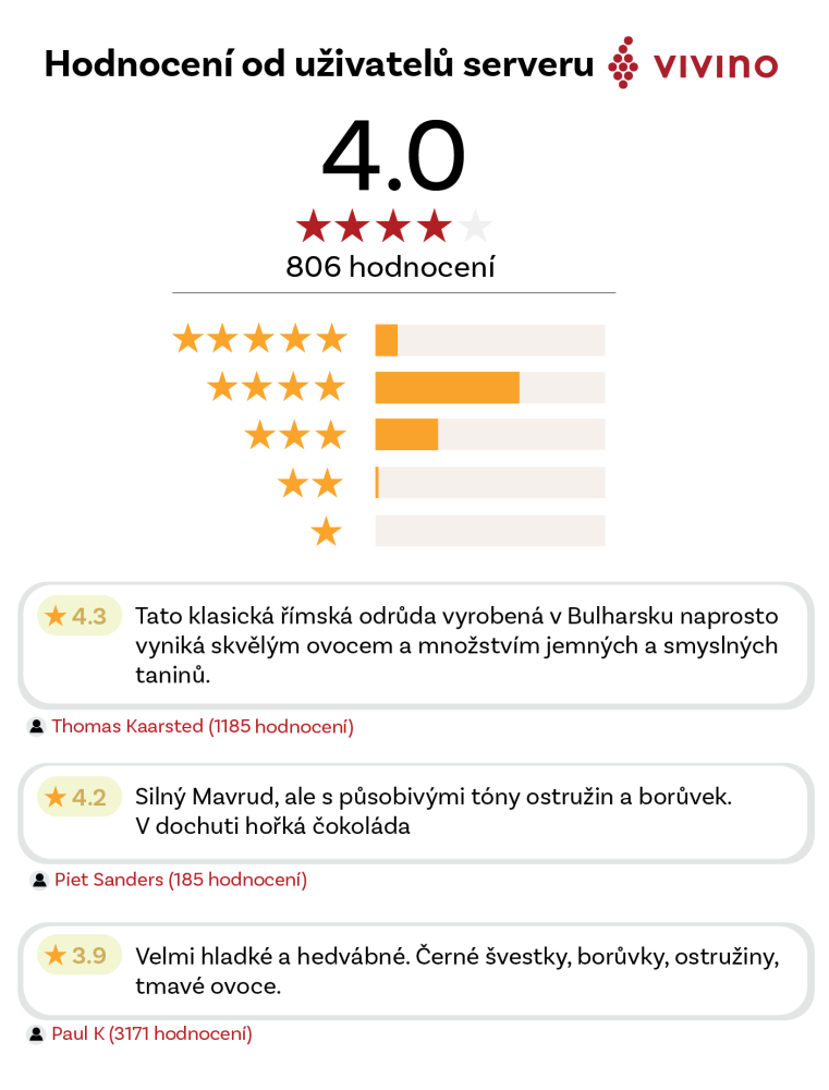 Bulharské červené víno vyrobené z místní odrůdy Mavrud ve věhlasném Thráckém údolí, vinařstvím Miroglio. Jedná se o víno s komplexním vyjádření této původní odrůdy, která si opět po letech na bulharských vinicích vydobývá své místo. Více